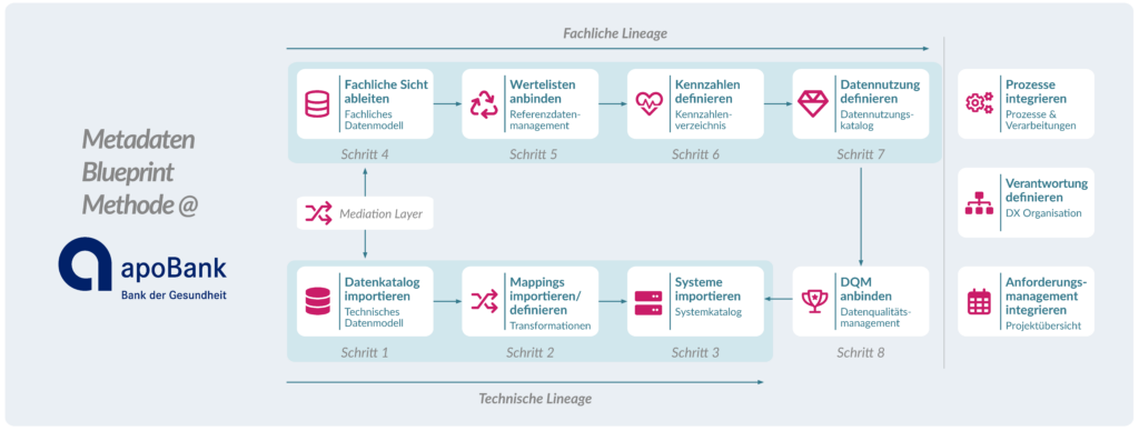 Der Aufbau der Data Excellence-Organisation und die Einführung der Software erfolgte nach der dataspot. Blueprint-Methode. Diese beinhaltet sowohl den unternehmensweit geschaffenen Metadatenstandard für die apoBank als auch die Modellierungsvorgaben (Sprache, Umfang, Granularität,…) für die Datenmodelle: