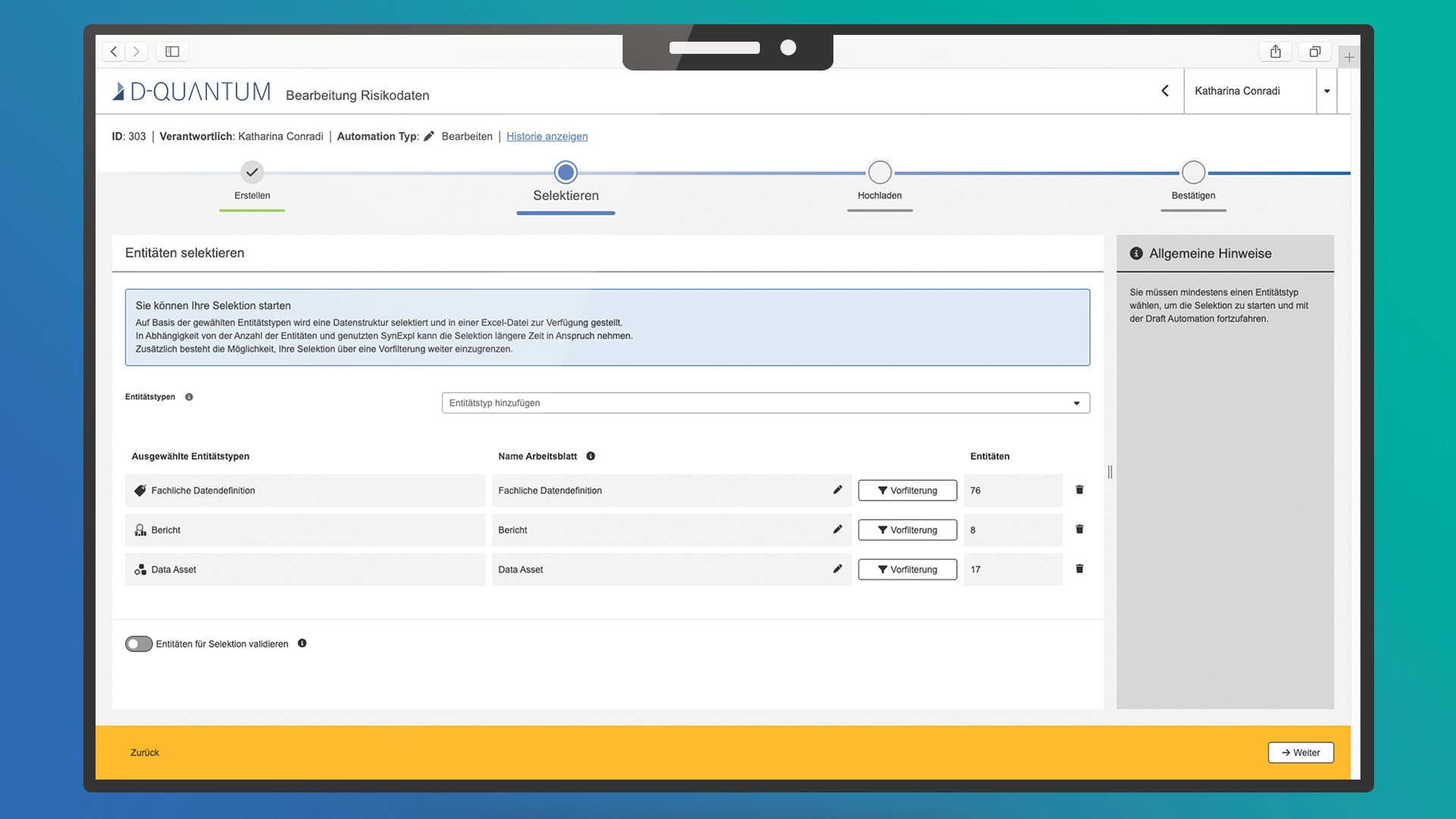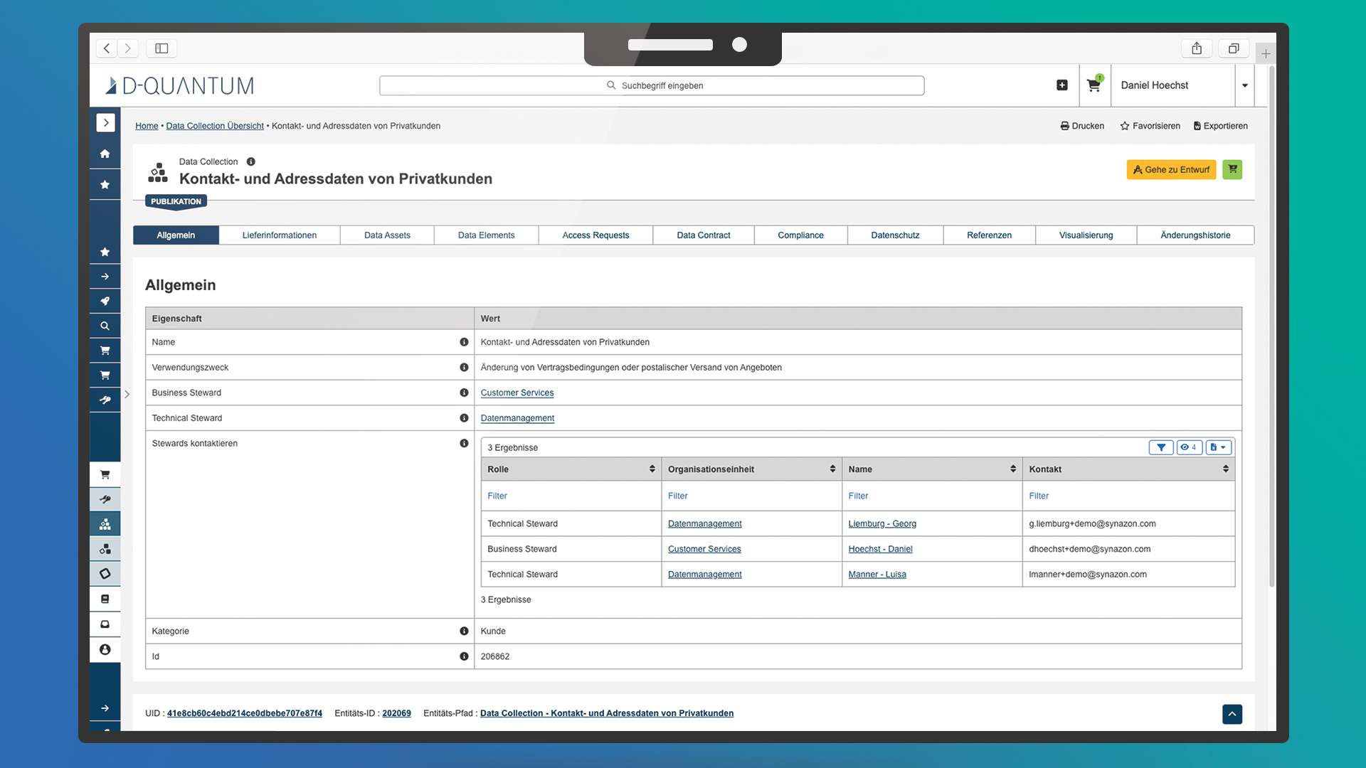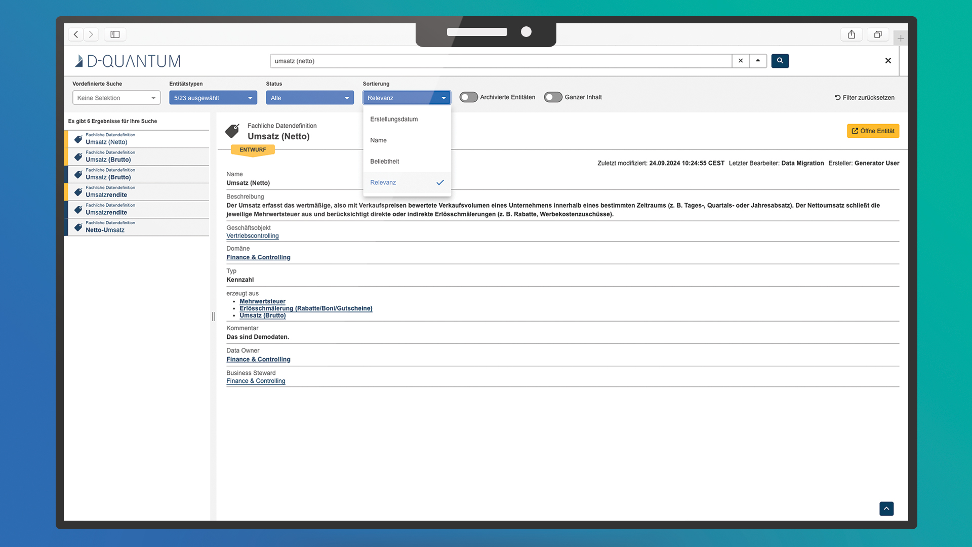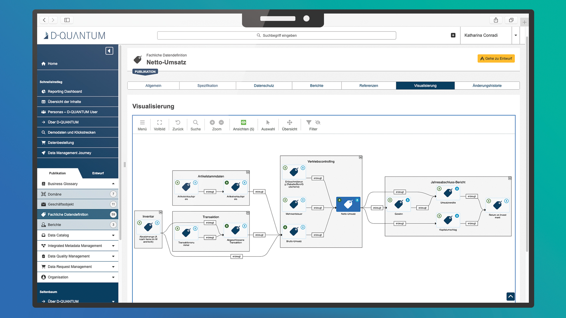 D-QUANTUM bietet eine zentrale Sicht auf alle Datenressourcen und erleichtert so deren Verwaltung und Nutzung. Eine klar definierte Taxonomie ermöglicht es Ihnen und Ihrem Team, benötigte Daten schnell zu finden, Redundanzen aufzudecken und Komplexität zu reduzieren.