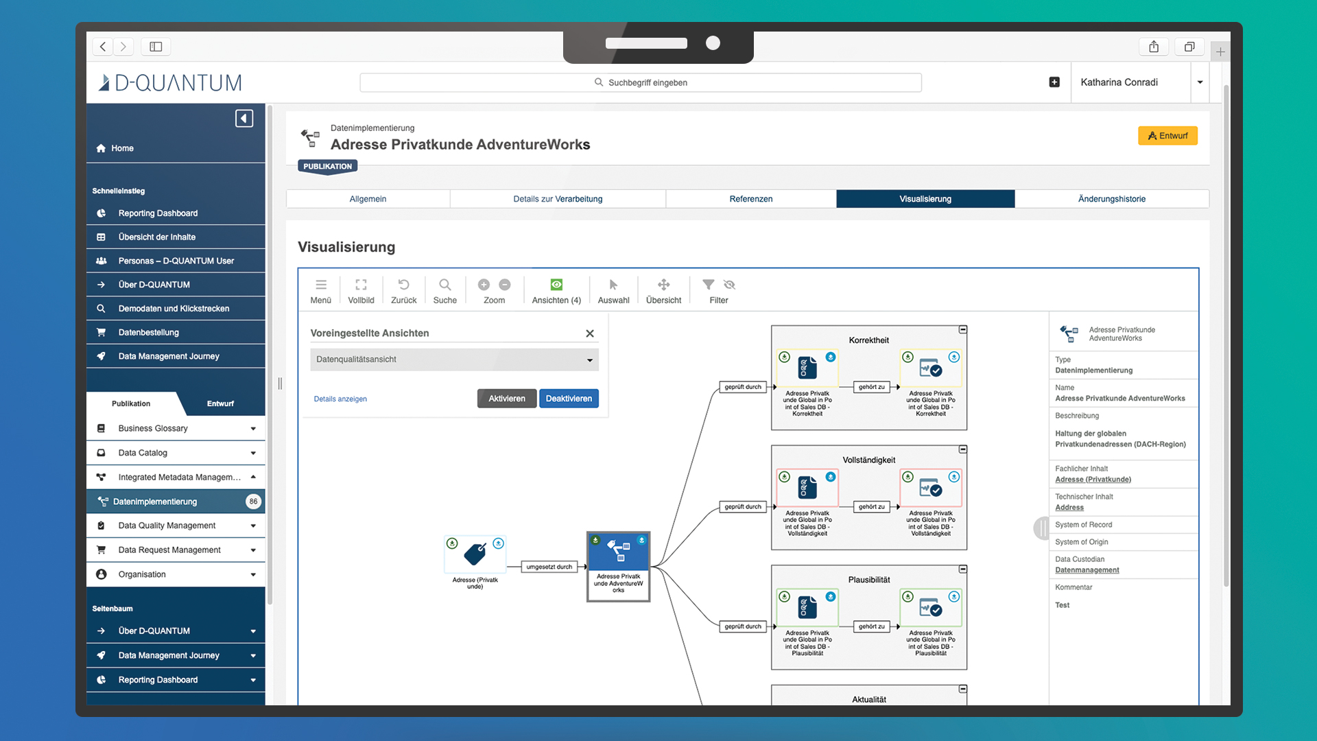 D-QUANTUM erhöht die Transparenz in der Datenverarbeitung und unterstützt dabei die Qualität der Daten zu steigern. Nutzen Sie D-QUANTUM, um Fehler- oder Auswirkungsanalysen durchzuführen. Mit der Data Lineage lassen sich Fehler in Berichten und Kennzahlen bis zum Quellsystem nachverfolgen und Qualitätsprobleme in der Datenverarbeitung aufdecken. Führen Sie Qualitätschecks durch und identifizieren Sie betroffene IT-Systeme im Datenkatalog.