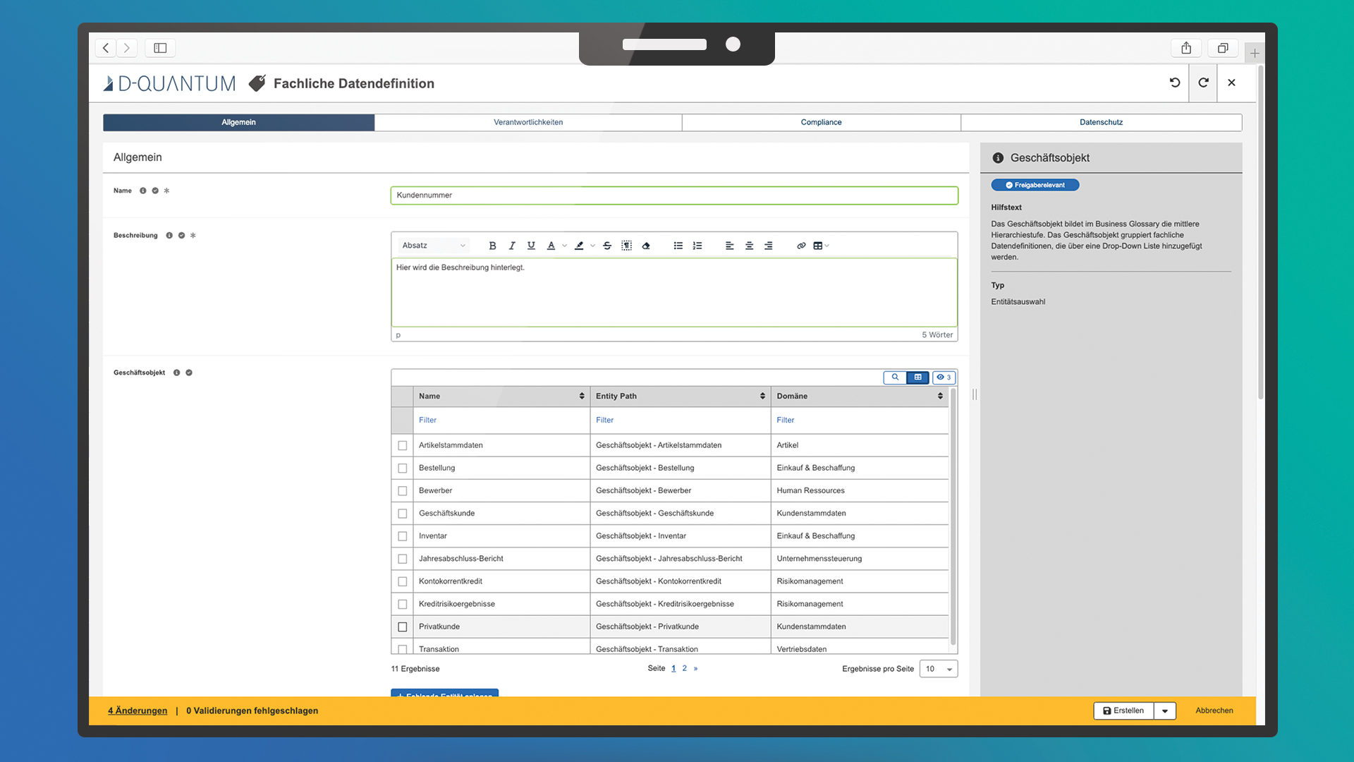 D-QUANTUM ist eine Datenkatalog- und Data Governance-Lösung, die sowohl von der IT als auch von Fachanwendern genutzt wird. Es wurde zunächst als Projektlösung entwickelt und dann zu einem hochgradig anpassbaren Tool, das mit den Anforderungen des Kunden wächst, ausgebaut. Heutzutage können Kunden wählen, ob sie vordefinierte Anwendungsfälle oder spezielle Standardlösungen verwenden oder ob sie die Lösung konfigurieren möchten, um einen individualisierten Katalog zu erhalten.