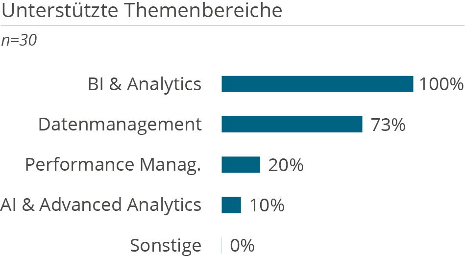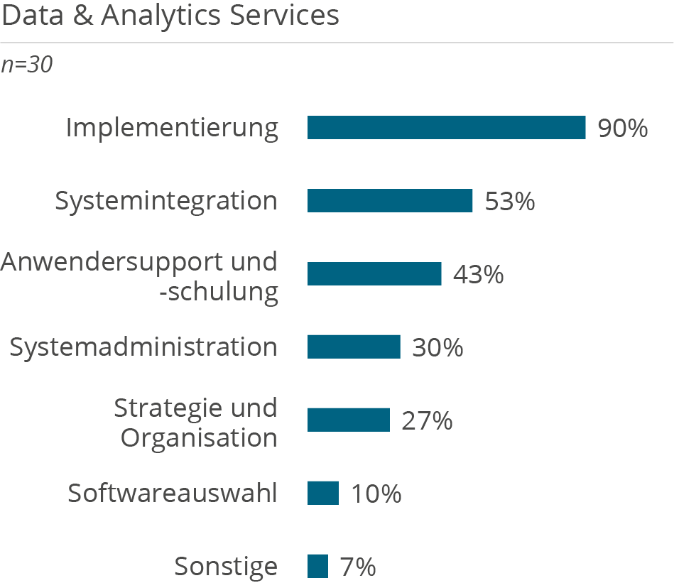 Die folgenden Demografie-Grafiken zeigen neben Kundendemografie (Unternehmensgröße und Branche), die Unterstützung der Kunden aufgeteilt nach Tätigkeiten in D&A Themenbereichen, erbrachten Services sowie eingesetzten Technologien.