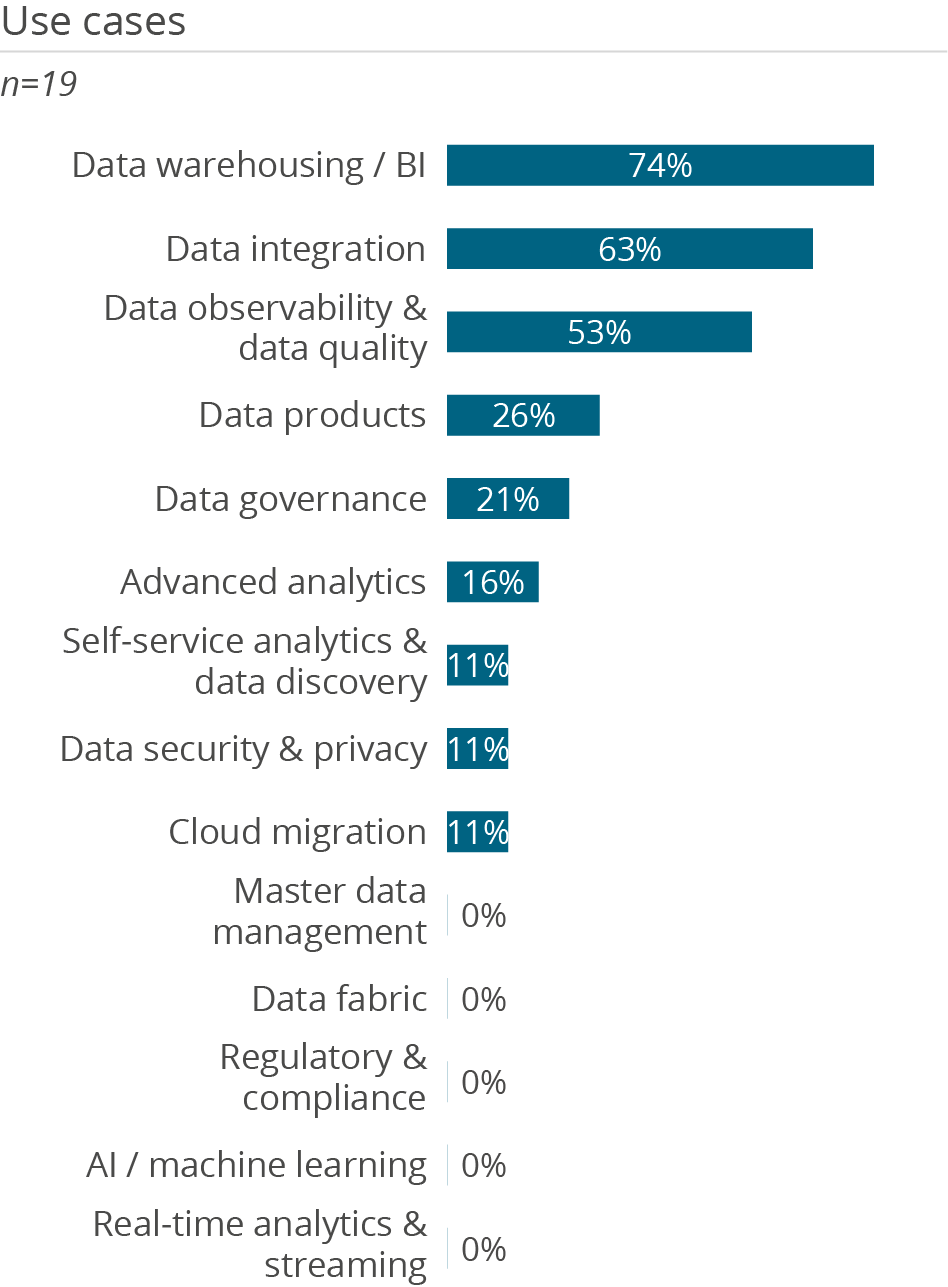 • Widespread use: Widespread adoption means 37% cite available tool know-how versus the survey average of 18%, demonstrating robust community resources and showing how widespread dbt Core/Cloud is used across the data teams within our panel and beyond.